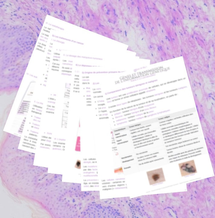 Notions : définition d’une tumeur, types de tumeurs (bénignes et malignes), étapes de la cancérogenèse (initiation, promotion, progression), proto-oncogènes et anti-oncogènes, facteurs de risque du cancer (exogènes et endogènes), prévention du cancer, dépistage du cancer (examen anatomopathologique, marqueurs tumoraux, imagerie médicale), traitements du cancer (chirurgie, chimiothérapie, radiothérapie, autres traitements).